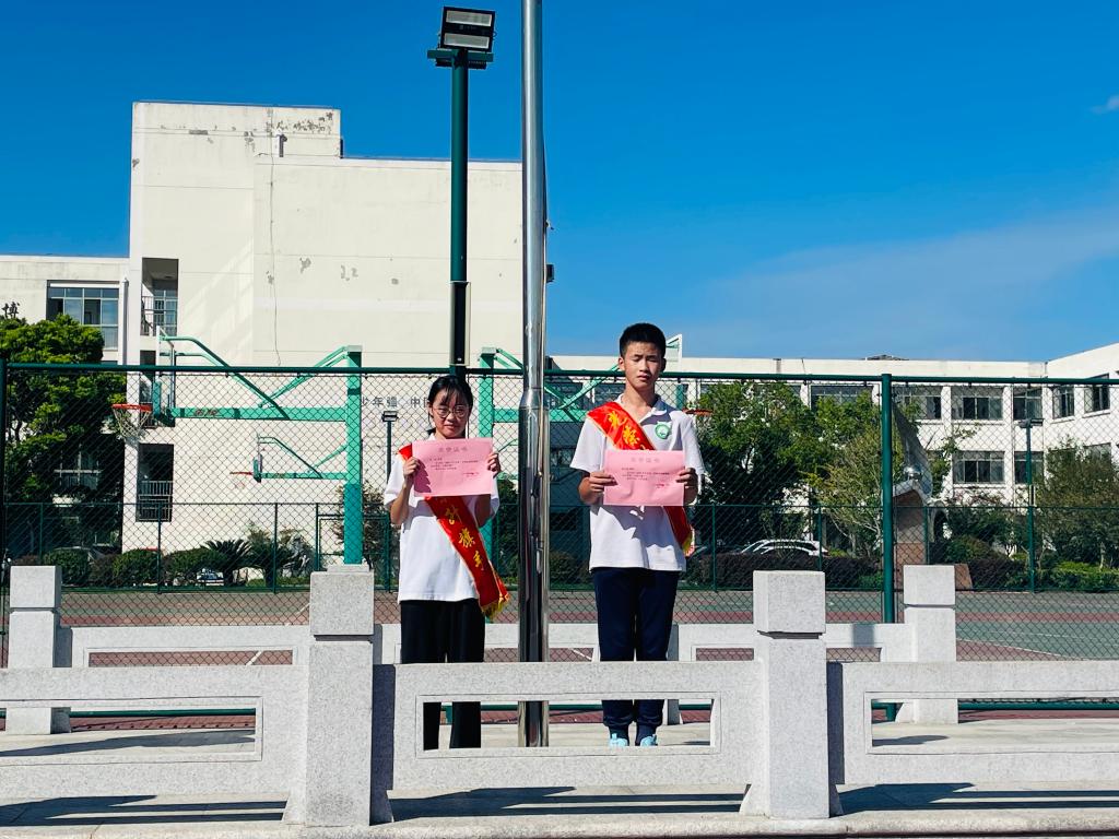 首先,初二(1)班的赖希炎、李思两位同学担任升旗手升旗,周国强校长为升旗手颁发了“光荣升旗手”荣誉证书。