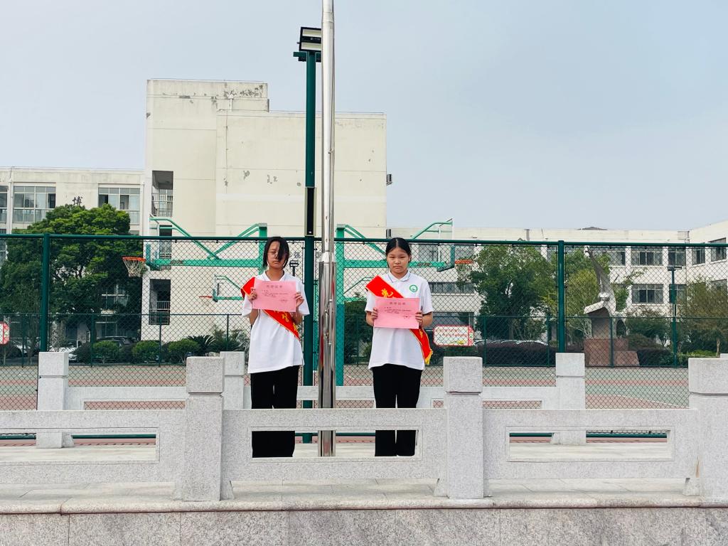 首先,初二(3)班的李媛、陈晨两位同学担任升旗手升旗,周国强校长为升旗手颁发了“光荣升旗手”荣誉证书。