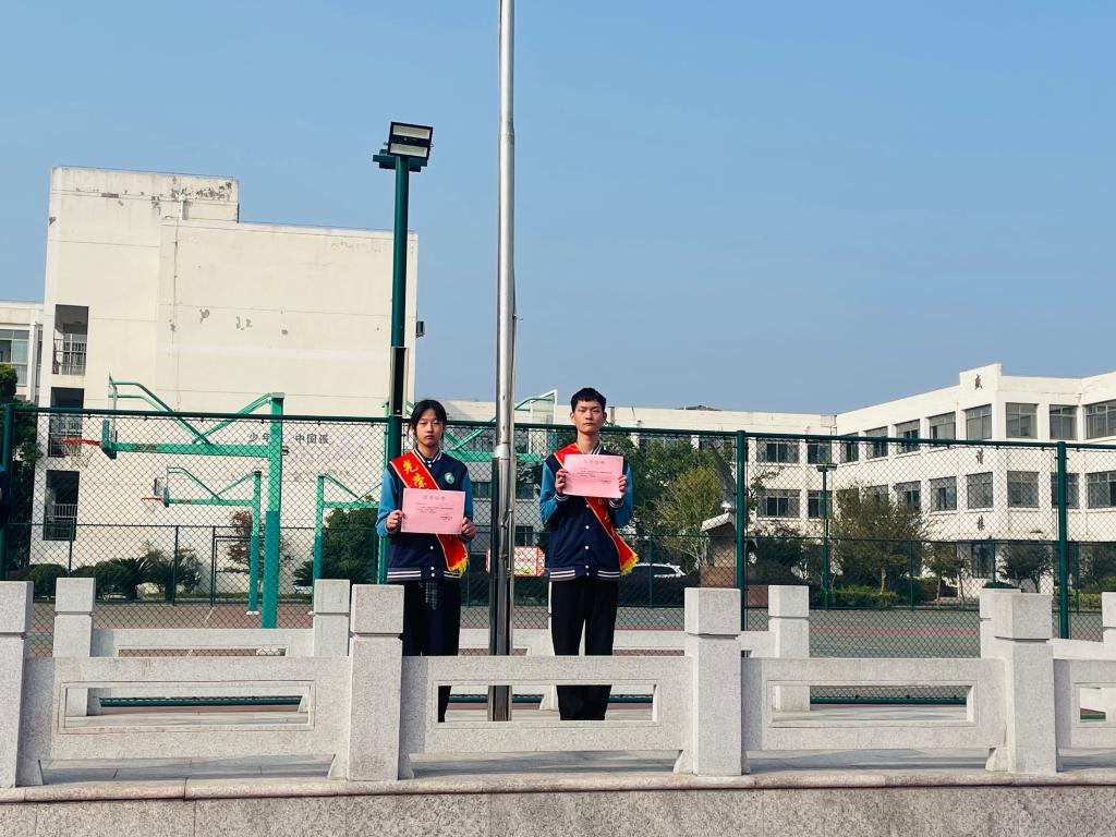 首先,初三(2)班的何佳静、李博两位同学担任升旗手升旗,周国强校长为升旗手颁发了“光荣升旗手”荣誉证书。