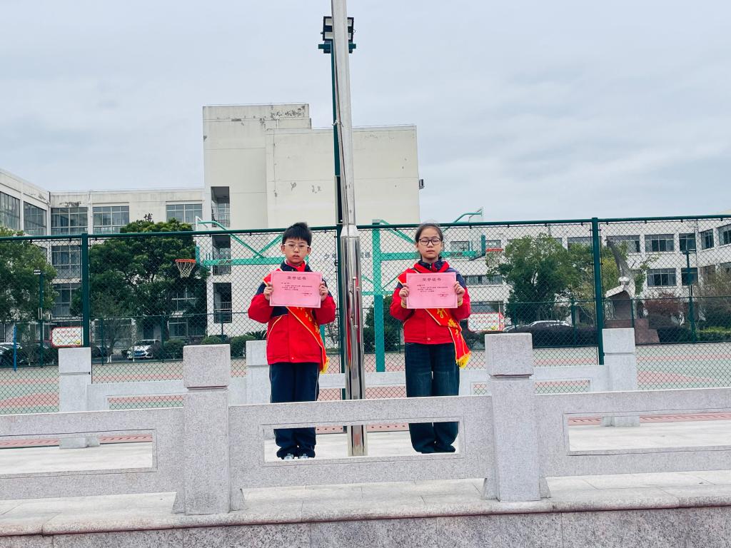 首先,六年级(1)班的林晨曦 、何一诺两位同学担任升旗手升旗,周国强校长为升旗手颁发了“光荣升旗手”荣誉证书。