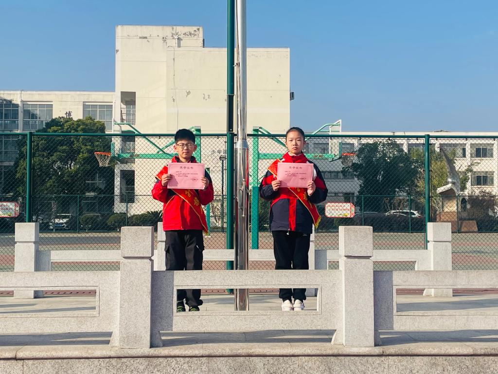 首先,六年级(2)班的王胜博 、林锶琪两位同学担任升旗手升旗,周国强校长为升旗手颁发了“光荣升旗手”荣誉证书。
