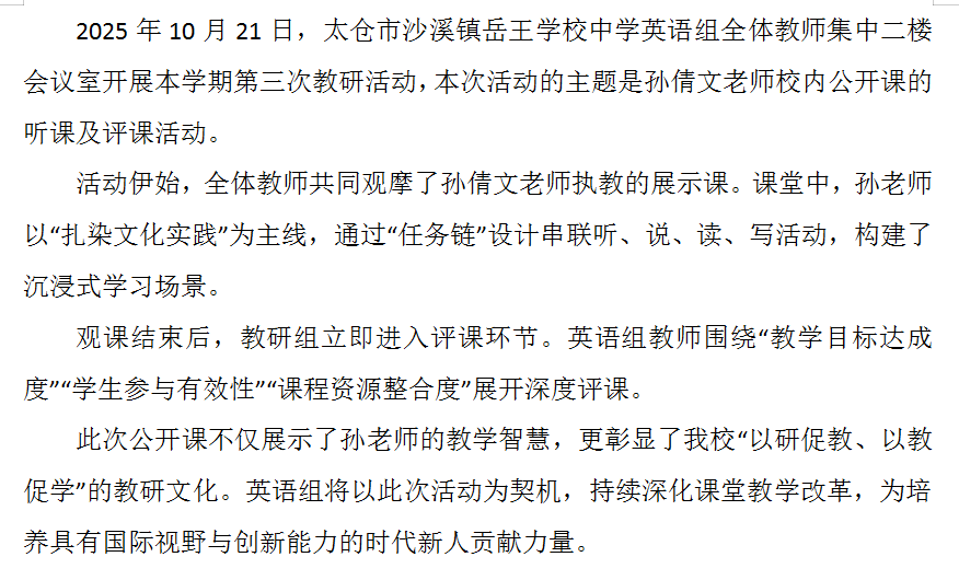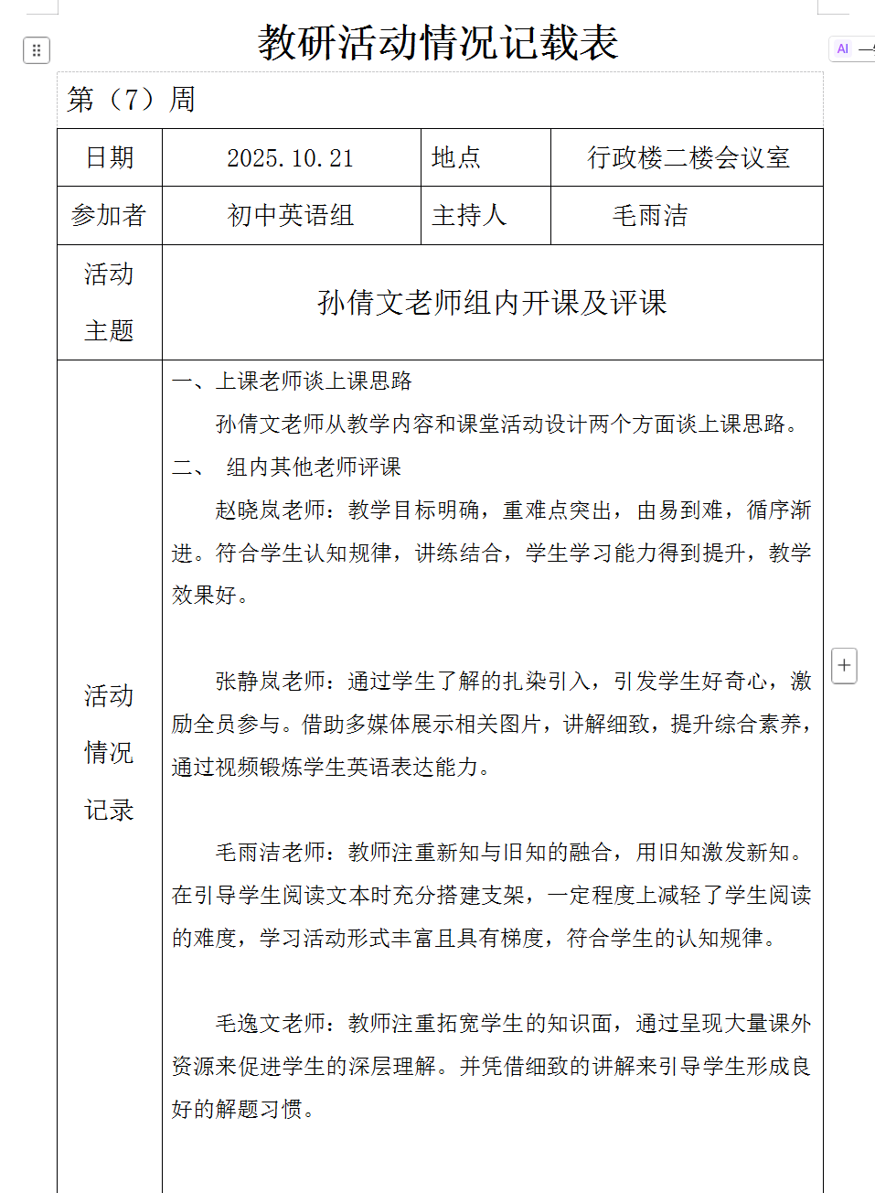 (品牌建设)构建生长课堂2025-2026第一学期中学英语组第三次教研活动——孙倩文老师组内开课及评课