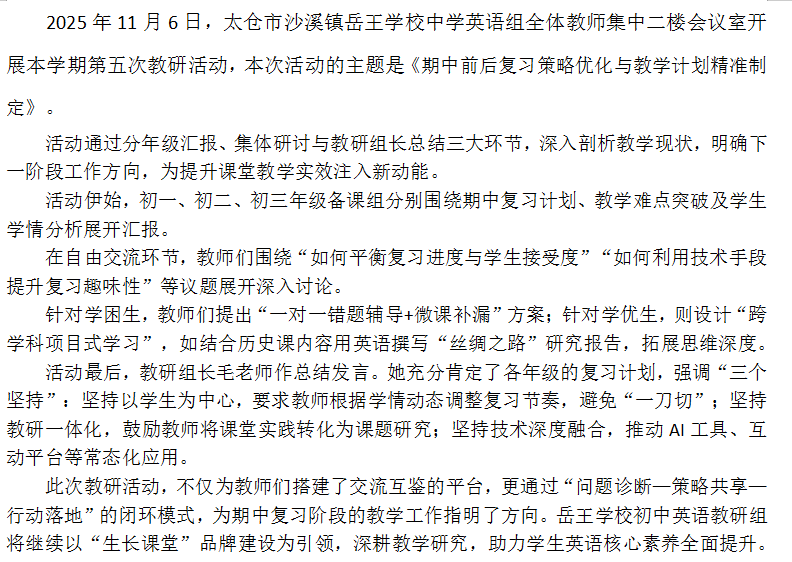 (品牌建设)构建生长课堂2025-2026第一学期中学英语组第五次教研活动——期中前后复习策略优化与教学计划精准制定