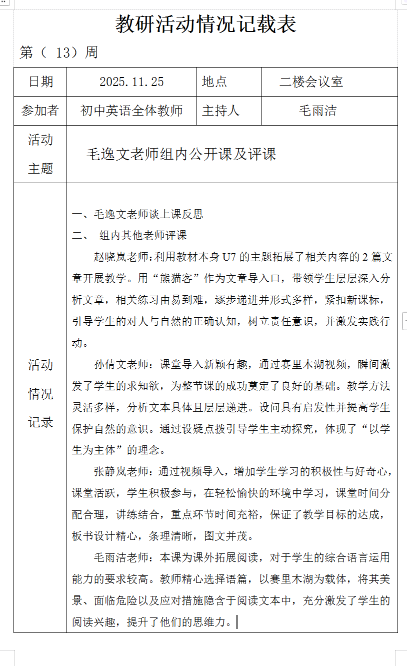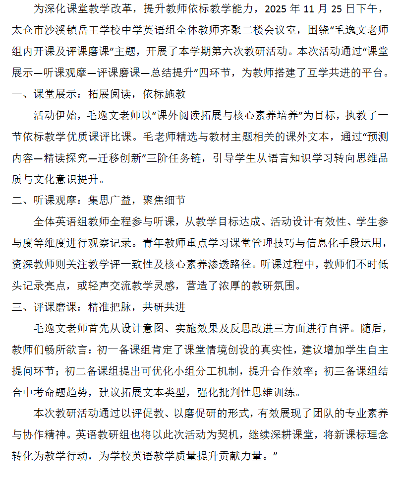 (品牌建设)构建生长课堂2025-2026第一学期中学英语组第六次教研活动——毛逸文老师组内开课及评课