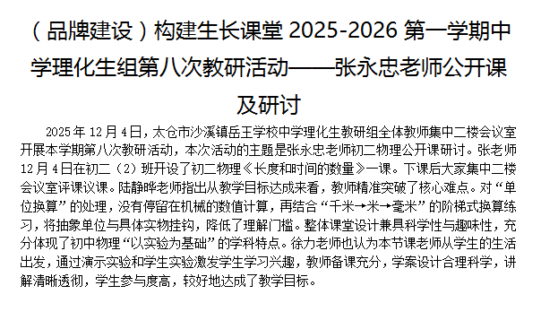 (品牌建设)构建生长课堂2025-2026第一学期中学理化生组第八次教研活动——张永忠老师公开课及研讨