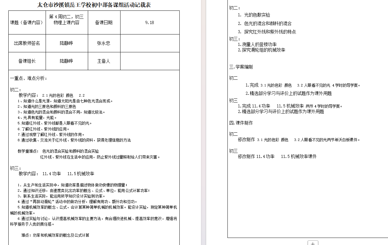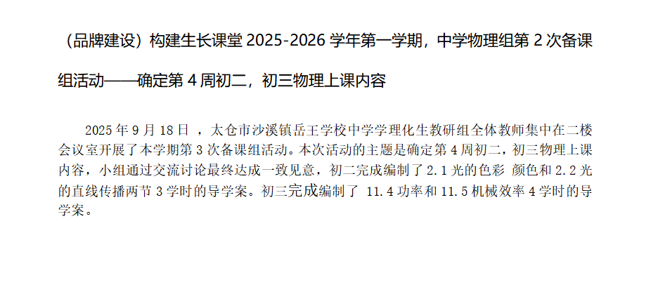 (品牌建设)构建生长课堂2025-2026学年第一学期,中学物理组第2次备课组活动——确定第4周初二,初三物理上课内容