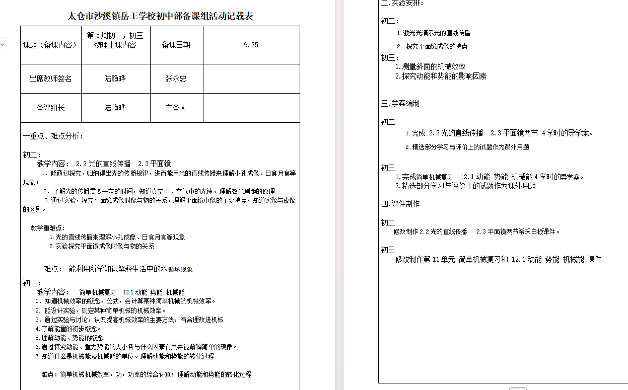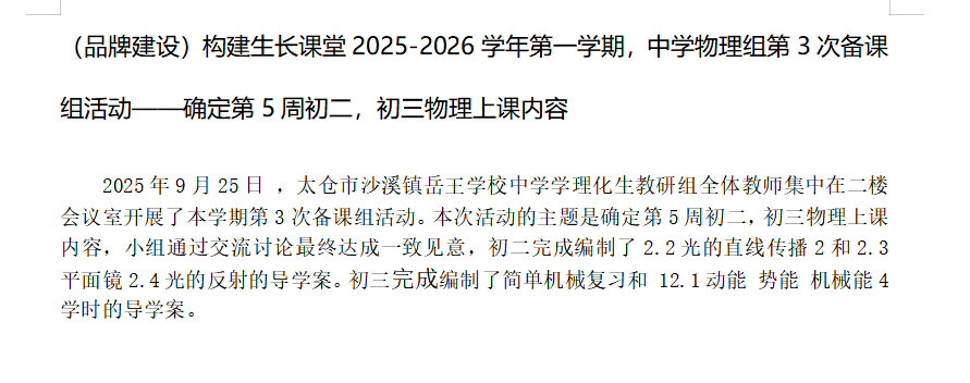 (品牌建设)构建生长课堂2025-2026学年第一学期,中学物理组第3次备课组活动——确定第5周初二,初三物理上课内容