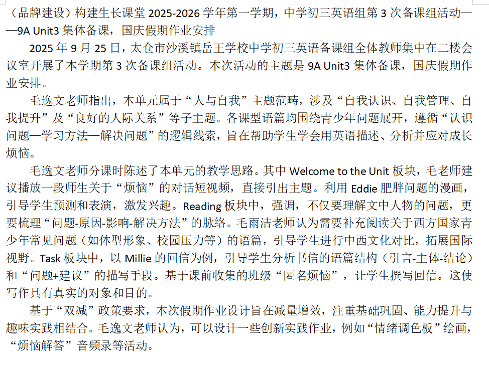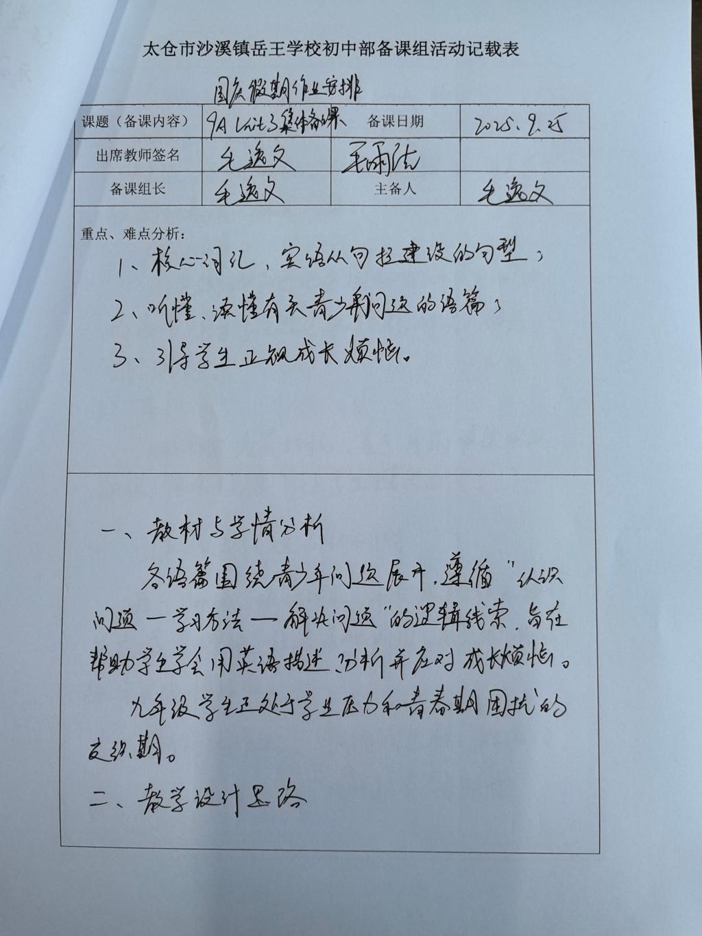 (品牌建设)构建生长课堂2025-2026学年第一学期,中学初三英语组第3次备课组活动——9A Unit3集体备课,国庆假期作业安排