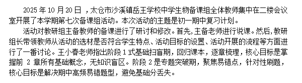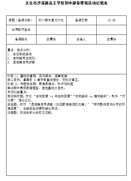 (品牌建设)构建生长课堂2025-2026第一学期,中学生物组第七次备课组活动——初一期中复习计划