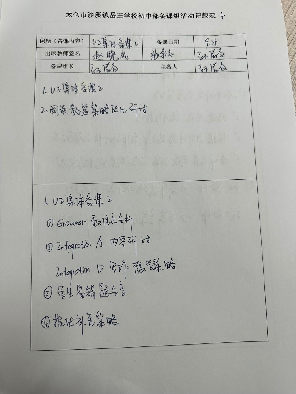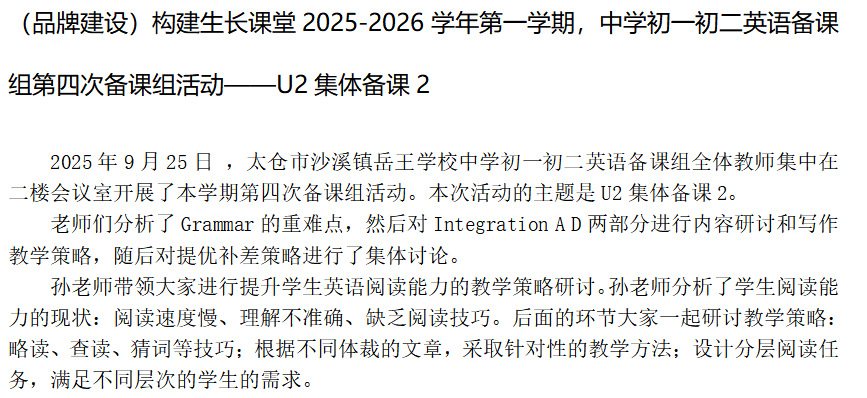 (品牌建设)构建生长课堂2025-2026学年第一学期,中学初一初二英语备课组第四次备课组活动——U2集体备课2
