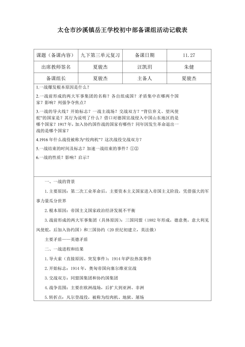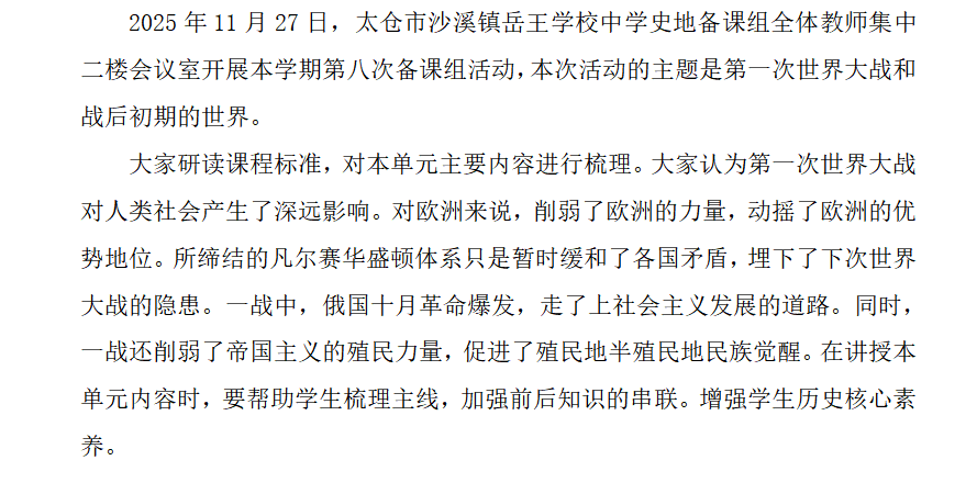 (品牌建设)构建生长课堂2025-2026第一学期,中学史地组第八次备课组活动—第一次世界大战和战后初期的世界