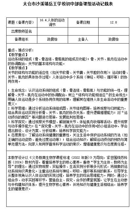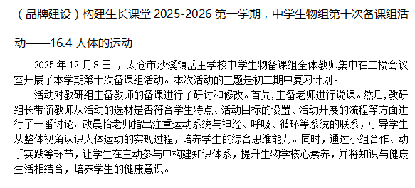 (品牌建设)构建生长课堂2025-2026第一学期,中学生物组第十次备课组活动——16.4人体的运动