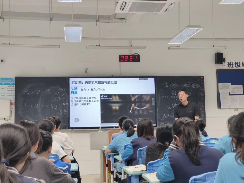 首先进行的是课堂观摩环节,由主持人岳王学校的陈益锋老师执教,主题为《化学实验与科学探究主题式复习课——火焰的故事》。陈老师以火焰为载体,结合中国在化学发展中的贡献,体现了培养学生“科学探究与实践”的化学科学核心素养要求。陈老师从现象和生活现实中提出问题创设情境引发学生思考,并通过实验探究验证猜想、解决问题,学生的课堂参与度很高。