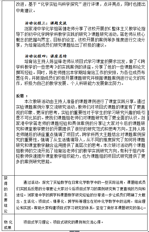 浏家港中学化学组蒋健老师分享了该校开展的《整体主义教学论指导下的初中化学跨学科教学实践的研究》课题研究活动,蒋老师从核心概念的把握与界定、目标的设定、该校开展的案例等多维度进行交流分享,为培育站成员们研究课题给出了积极的建议。