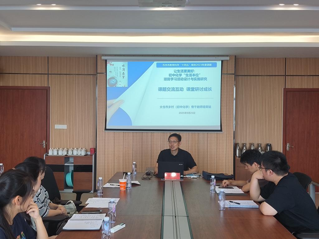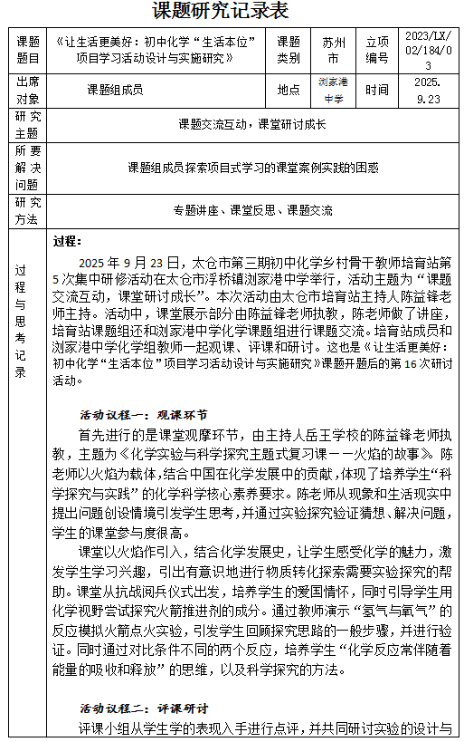 2025年9月23日,太仓市第三期初中化学乡村骨干教师培育站第5次集中研修活动在太仓市浮桥镇浏家港中学举行,活动主题为“课题交流互动,课堂研讨成长”。本次活动由太仓市培育站主持人陈益锋老师主持。活动中,课堂展示部分由陈益锋老师执教,陈老师做了讲座,培育站课题组还和浏家港中学化学课题组进行课题交流。培育站成员和浏家港中学化学组教师一起观课、评课和研讨。这也是《让生活更美好:初中化学“生活本位”项目学习活动设计与实施研究》课题开题后的第16次研讨活动。